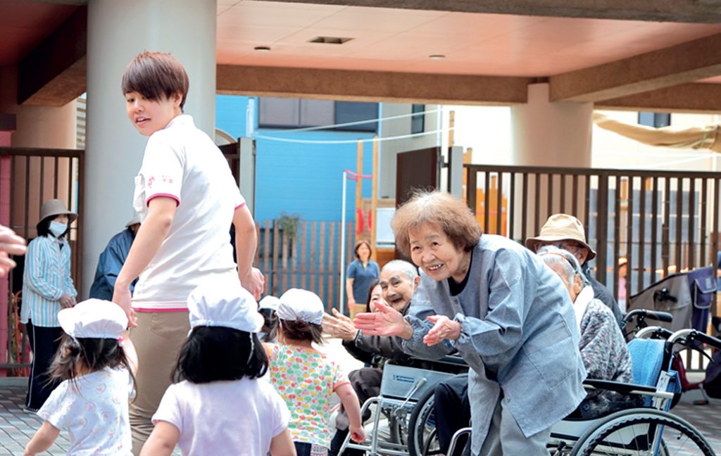 Để chăm sóc tốt cho người già, Nhật Bản đã chuẩn bị các hình thức chăm sóc lão khoa khác nhau. Trong ảnh là KOTOEN, nơi chăm sóc liên thế hệ – cả người già và trẻ em. Mô hình này được hiệp hội Hưu trí Hoa Kỳ đánh giá là mô hình cộng đồng thành công và bền vững. Nguồn ảnh: kotoen.or.jp