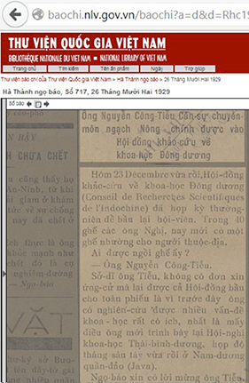 Tuy nhiên, không chỉ báo chí Việt Nam, mà cả hệ thống các cơ quan lưu trữ của Pháp cũng có những tài liệu phong phú, quý hiếm về nhà khoa học Nguyễn Công Tiễu, ví dụ như Agence Bibliographique de l’Enseignement Supérieur.4 Trên thực tế, trong quá trình tìm kiếm thông tin, ba tác phẩm liệt kê ở trên của cụ Tiễu được tìm thấy nhờ truy cập vào trang web lưu trữ của Thư viện Quốc gia Pháp, trong đó chứa gần như trọn vẹn các công trình nghiên cứu đã đăng tải của cụ Tiễu trên tạp chí khoa học rất có giá trị thời đó là Bản tin Kinh tế Đông dương (Bulletin économique de l’Indochine).5