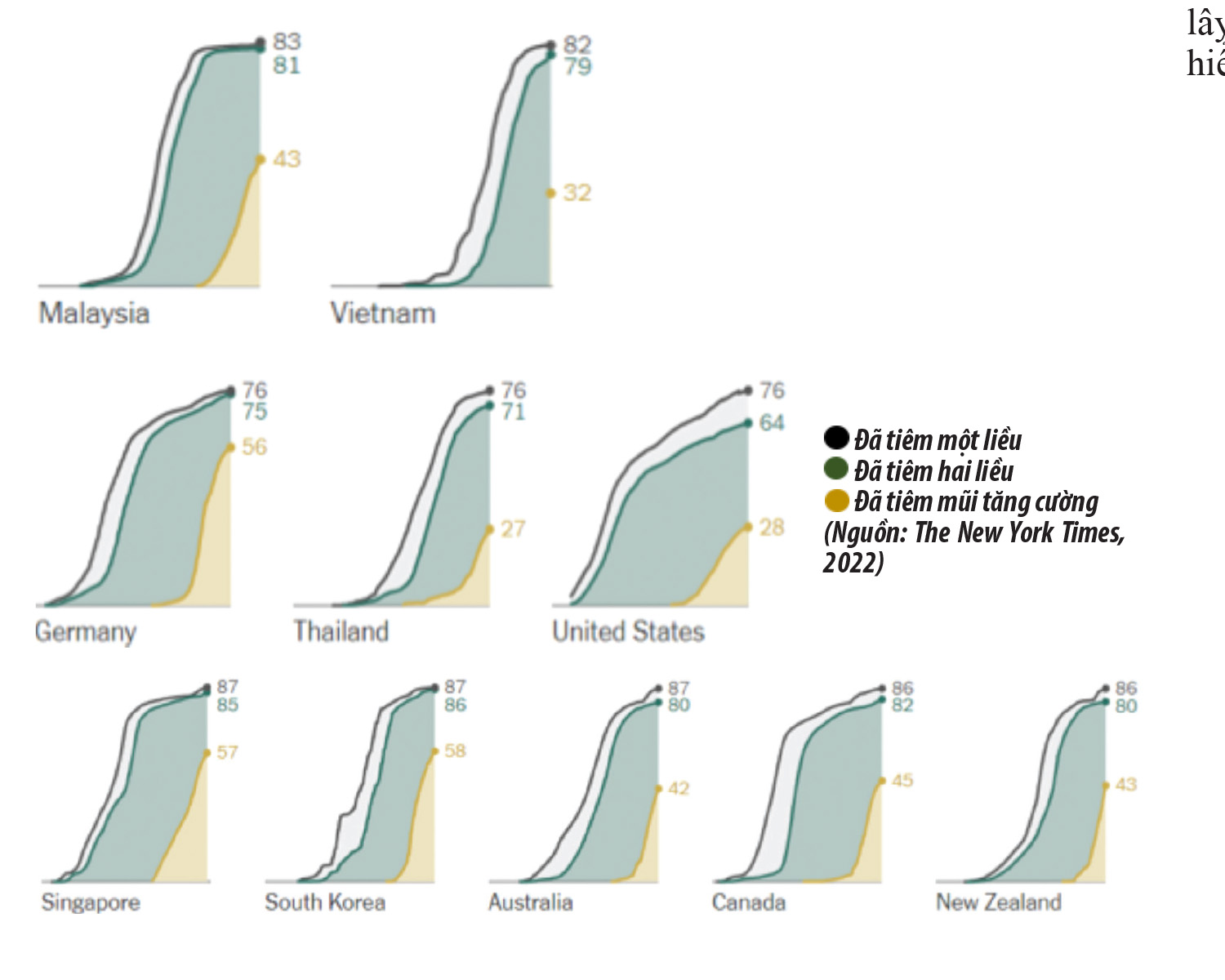 Nhìn vào biểu đồ của The New York Times với dữ liệu được tổng hợp từ trang Our World in Data cho thấy khi tỉ lệ tiêm chủng mũi một và mũi hai đạt khoảng 70% dân số, đường đồ thị có xu hướng đi ngang thay vì đi lên, thể hiện tốc độ tiêm chủng bắt đầu chậm lại, trong khi diễn biến của dịch bệnh vẫn chưa hoàn toàn được kiểm soát.