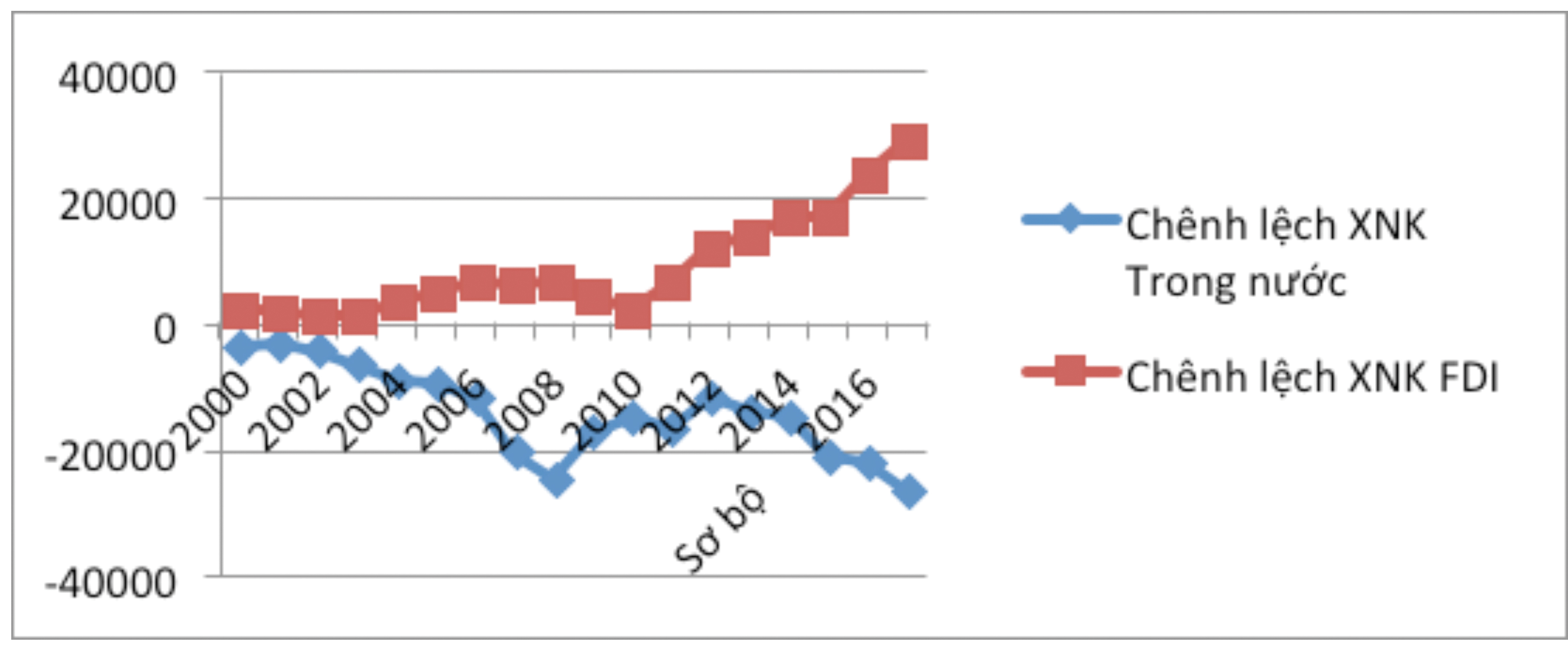 Hình 4. Chênh lệch XNK của khu vực kinh tế trong nước và khu vực FDI. Nguồn: TCTK.