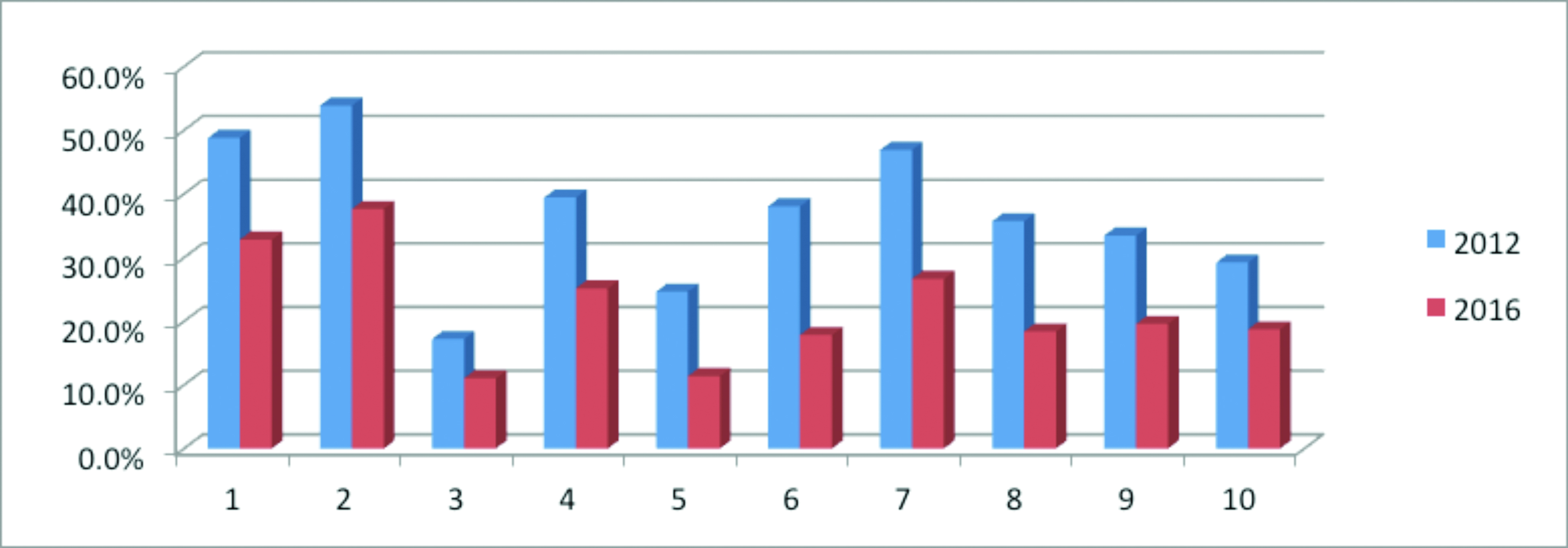 Nhìn từ góc độ khác, tính toán mô hình cân bằng tổng thể trong các giai đoạn cho thấy xuất khẩu tuy làm tăng giá trị sản xuất so với giai đoạn trước khoảng 12% nhưng lan tỏa đến giá trị gia tăng giảm (-13.3%) và quan trọng hơn là lan tỏa đến nhập khẩu tăng rất mạnh (52%). Sử dụng bảng cân đối liên ngành 2012 và 2016 cho thấy hàm lượng giá trị tăng thêm trong xuất khẩu giảm ở hầu hết các ngành (Hình 5).
