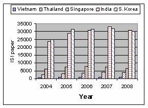 Thông qua công cụ ISI Web of Science chúng ta có thể dễ dàng tìm được số lượng các công trình khoa học được công bố đối với mỗi quốc gia cũng như đối với từng cá nhân các nhà khoa học. Chúng ta hãy so sánh thành tích của khoa học Việt Nam trong thời gian 5 năm từ 2004-2008 (tính đến thời điểm tháng 09/2008) với một số quốc gia trong khu vực. Từ đây có thể nhận thấy rằng chúng ta không thể so sánh nổi với Ấn độ và Hàn Quốc, nhưng ngay cả với ông bạn láng giềng Thái Lan chúng ta cũng đã thua kém quá xa. Thái Lan chỉ có hơn 65 triệu dân, nghĩa là vào khoảng 76% dân số Việt Nam (85 triệu) và chắc rằng số lượng các GS-PGS cũng ít hơn so với Việt Nam. Thế nhưng số lượng công trình khoa học của Thái Lan mạnh hơn ta rất nhiều. Trong giai đoạn 2004-2008 Việt Nam chỉ đạt khoảng 20% số lượng công bố của Thái Lan. Đây là vấn đề đáng để chúng ta suy nghĩ, vì nó chính là hệ quả trực tiếp từ các chuẩn mực sai lệch về bằng cấp, chức danh.