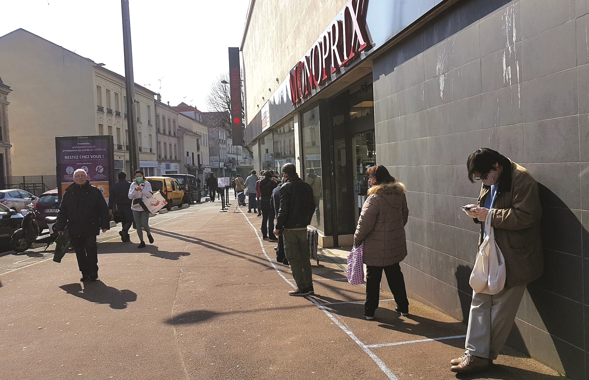 Sau khi có bản phân tích của ủy ban khoa học, ngay tối ngày 24/3, Thủ tướng phát biểu tuyên bố xiết chặt lệnh phong tỏa: mọi công dân chỉ được ra khỏi nhà để mua nhu yếu phẩm hay chơi thể thao tối đa 1 tiếng và trong bán kính 1km², ra khỏi nhà phải mang theo giấy chứng nhận di chuyển nếu không cảnh sát sẽ phạt 135 euros, phải đứng cách xa nhau 1m tại các cửa hàng siêu thị, cấm họp chợ trời … Ảnh: Thụy Phương.