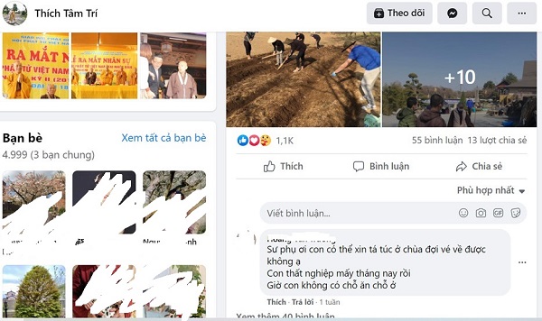 Một thực tập sinh thất nghiệp, hết hạn thị thực đang comment xin tá túc ở chùa Đại Ân. Ảnh chụp màn hình