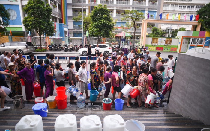 Người dân xếp hàng lấy nước từ các xe cấp nước tạm thời của thành phố. Ảnh: Zing.