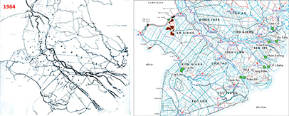 ![]() Hình 1. Mạng lưới kênh rạch ở ĐBSCL năm 1964 (trái) và năm 2011 (phải). |