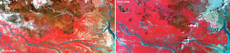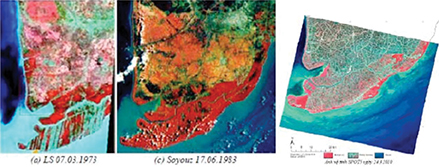 ![]() Hình 3. Diễn biến rừng ngập mặn ở Cà Mau. Ảnh vệ tinh từ trái qua phải 1973, 1983 và 2010. |