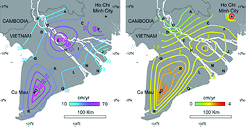 ![]() Hình 5. Tốc độ tụt của mực nước ngầm (trái) và tốc độ sụt lún bề mặt của đồng bằng (phải). |