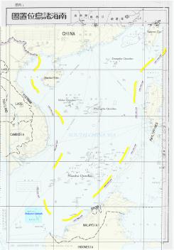 Tài liệu của tác giả họ Vũ không có kèm bản đồ, còn tài liệu của hai tác giả họ Lí có đưa vào bản đồ 9 vạch nhưng không phải từ bản đồ gốc năm1947 hay 1953 mà lấy nguồn từ nước ngoài (Hasjim Djalal, “Conflicting Territorial and Jurisdictional Claims in South China Sea,” The Indonesian Quarterly, vol. 7, no. 1 (1979), 36 at 52). Nguồn từ trang mạng www.nansha.org.cn cũng có đưa ra bản đồ 11 vạch năm 1947 (hình 2) với tên bản đồ này là “Nam hải chư đảo vị trí lược đồ” (南海诸岛位置略图), tuy nhiên tên trên bản đồ (có vẻ mới dán chồng lên) chỉ là “Nam hải chư đảo vị trí đồ”, không có từ “lược” (南海诸岛位置图 – Nanhai zhudao weizhi tu)12 giống như hai tác giả họ Lí trình bày. Bài ‘Bản đồ chữ U : nguồn gốc và địa vị pháp lí’ (Nam hải “cửu đoạn tuyến” đích lịch sử do lai hòa pháp luật địa vị – 南海“九段線”的歷史由來和法律地位)13 trên trang mạng Hoàn cầu của nhà nước TQ cũng ghi là “Nam hải chư đảo vị trí lược đồ”.
