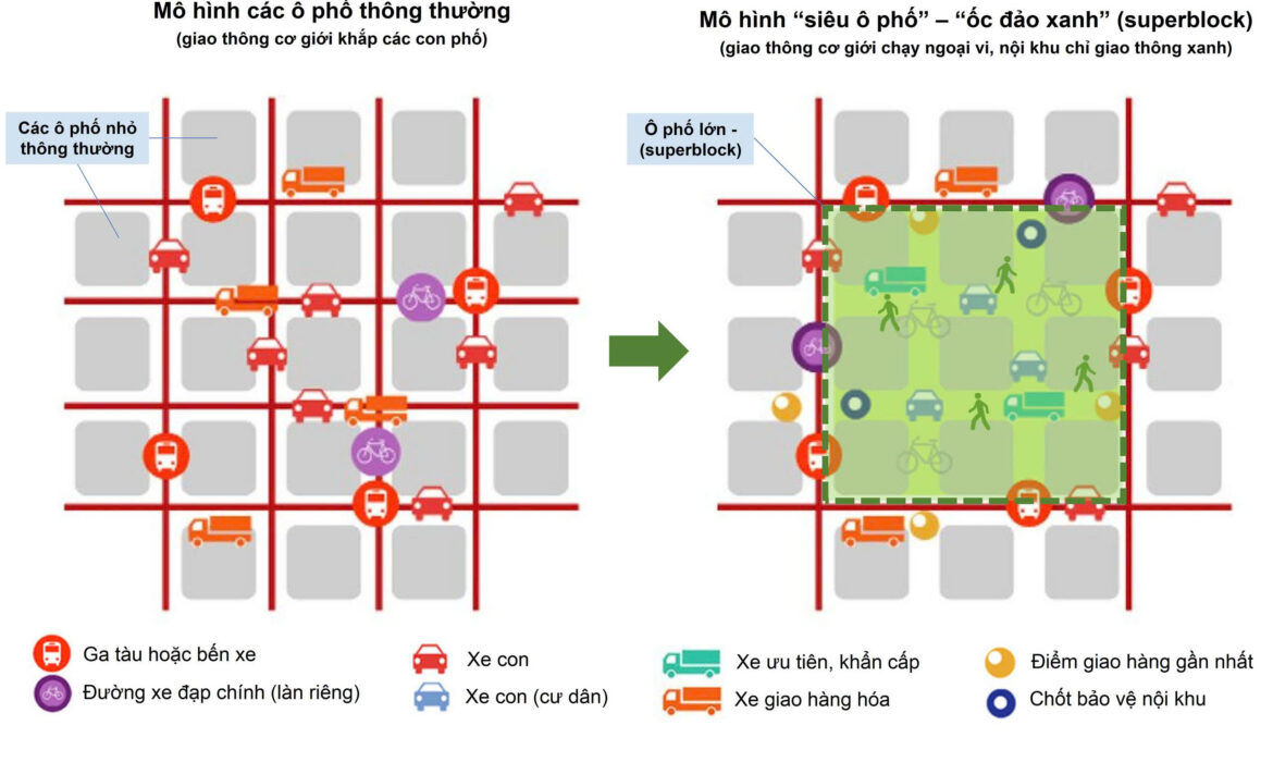 Quy hoạch đô thị cũng phải thay đổi căn bản. Một thành phố xanh không chỉ cần LEZ mà còn cần các “superblock” – “siêu ô phố” như một “ốc đảo xanh”, điển hình như ở Barcelona với mỗi chiều trên dưới 400m, tổng diện tích sẽ vào khoảng trên dưới 16ha. Một siêu ô phố sẽ gồm nhiều ô phố nhỏ, bên ngoài là xe cơ giới, bên trong dành cho giao thông xanh như đi bộ, xe đạp và buýt điện mini – tạo mạng lưới sinh thái giữa lòng đô thị. Chương trình cải tạo 79 khu tập thể cũ hiện nay của Hà Nội có thể được nghiên cứu để quy hoạch thiết kế lại thành superblock kiểu mới. Thí dụ, đồ án tái thiết khu tập thể Vĩnh Hồ có phạm vi nghiên cứu 22ha, tức là quy mô khoảng một superblock to, còn khu tập thể Trung Tự 13,2ha thì sẽ tương đương một superblock nhỏ. Song song với tái thiết tại chỗ theo hướng xanh hóa các khu đô thị nội đô là việc dịch chuyển các cơ sở đông người ra ngoại vi, giảm áp lực lên lõi đô thị.