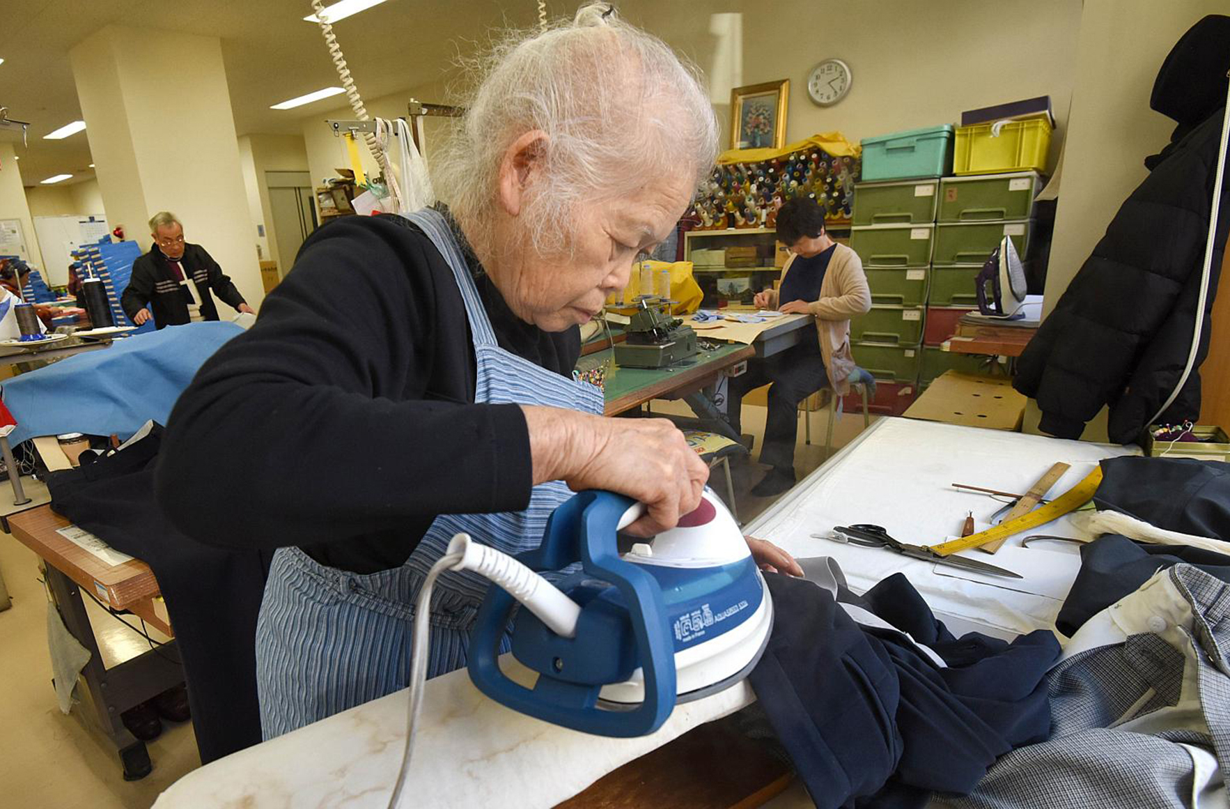 Người già sửa chữa quần áo tại một trung tâm lao động dành cho người cao tuổi ở Tokyo, 18/12/2015. Ảnh: AFP.