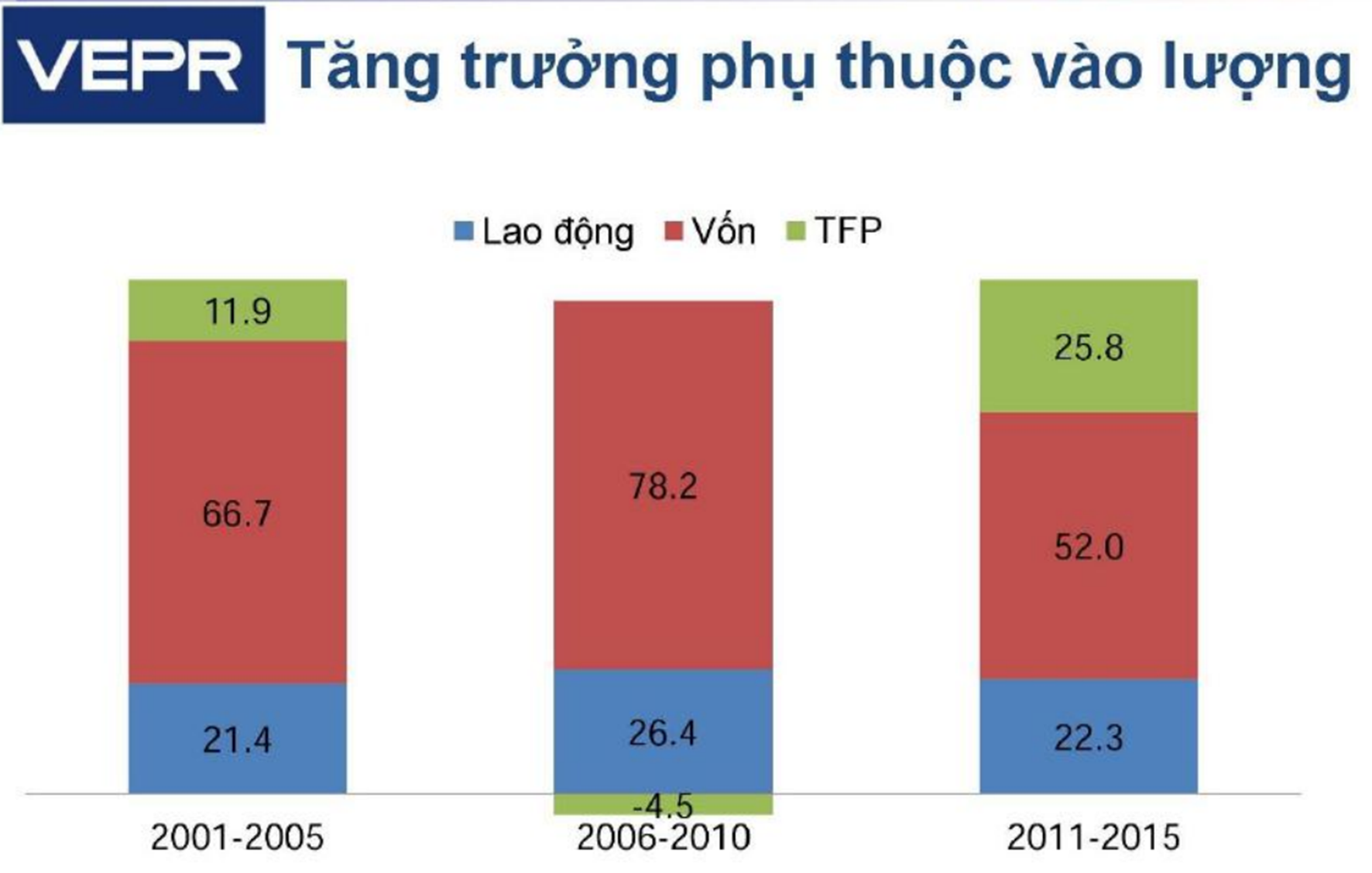 Việt Nam tăng trưởng kinh tế rất nhanh trong hai thập niên qua, nhưng tốc độ tăng trưởng đang sụt giảm dần do sự tăng trưởng dựa chủ yếu vào vốn, lao động giá rẻ, còn phần tăng trưởng dựa vào đổi mới sáng tạo và các đổi mới khác thì rất khiêm tốn, thay đổi thất thường theo thời gian (Hình 1). Đó là biểu hiện của tăng trưởng theo chiều rộng, như cách nói rộng rãi hiện nay. Sự năng động của khu vực kinh tế tư nhân chưa được phát huy thực sự, đến nay vẫn chỉ đóng góp dưới 10% vào GDP toàn nền kinh tế (Hình 2). Gần đây, sau thời kỳ khủng hoảng kinh tế thì động lực tăng trưởng kinh tế Việt Nam càng giảm do lượng vốn không còn dồi dào, nguồn lao động cũng đang đi qua giai đoạn dân số vàng (tiến sang già hóa). Điều đáng lo ngại là chúng ta có thể bị kẹt trong bẫy thu nhập trung bình thấp khi còn quá sớm. Nghĩa là trong khi các nước trên thế giới thường gặp khó khăn với bẫy thu nhập trung bình khi tìm cách vượt ngưỡng GDP đầu người khoảng 10.000 USD/năm, thì có thể Việt Nam sẽ “kẹt” ngay ở mức 2000 – 3000 USD/năm, và loay hoay nhích lên từng bước nhỏ một cách chật vật.