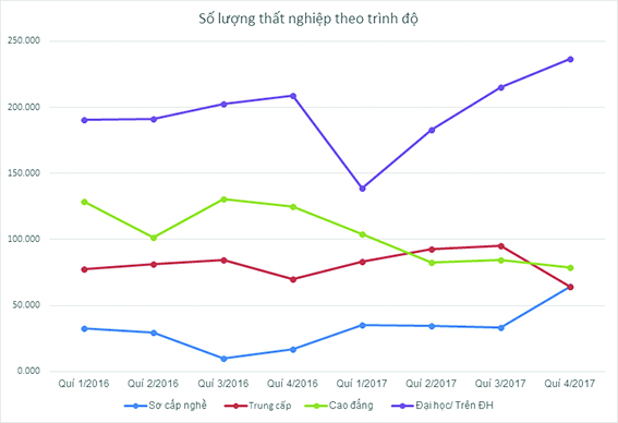 Tuy nhiên, vài năm gần đây các chỉ số thống kê về tỷ lệ thất nghiệp của những người đã qua đào tạo nghề nghiệp, đặc biệt của những người có trình độ ĐH trở lên luôn tăng mạnh và cao hơn so với với mặt bằng chung. Trong khi tỷ lệ thấp nghiệp trong độ tuổi lao động những năm gần đây dao động trong khoảng trên dưới 2%, thì tỷ lệ thất nghiệp của nhóm có trình độ ĐH thường cao gấp đôi chỉ số thất nghiệp chung của toàn bộ lực lượng lao động (xem hình 1). Đây có thể coi là một nghịch lý tồn tại trong một nền kinh tế khi nguồn nhân lực chất lượng cao trở nên dôi dư khi nhu cầu vẫn còn rất lớn.