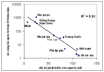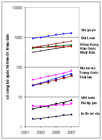 Biểu diễn năng suất NCKH trên thang lô ga như hình 1 rất dễ thấy công bố quốc tế của các nước tăng đều hằng năm theo cấp số nhân. Việt