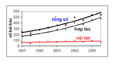 Công bố quốc tế có tên các tác giả Việt Nam trong mười năm qua tăng từ 256 bài năm 1997 lên 550 bài năm 2006, theo cấp số nhân, trung bình mỗi năm tăng 9-10% (hình 1). Nhưng sự tăng trưởng này chủ yếu là qua hợp tác với nước ngoài, số bài báo có địa chỉ thuần tuý Việt Nam (do nội lực) vẫn dẫm chân tại chỗ quanh con số trung bình 77 bài trong suốt mười năm qua (đường dưới cùng, hình 1). Tỷ lệ bài báo do nội lực và do hợp tác liên tục giảm từ 30% năm 1997 xuống còn 13% năm 2006 (hình 2).