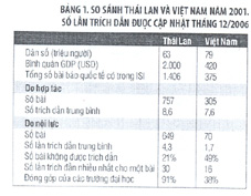 Với những thành tích trên hình 1, ta không thể định lượng được liệu Việt Nam đang ở đâu trên bản đồ thế giới nếu không so sánh với một nước khác, như Thái Lan chẳng hạn, nước láng giềng chưa thể xem là có đẳng cấp đáng kể về KHCN. Thông tin trên bảng 1 rút ra từ số liệu thống kê năm 2001. Chọn năm 2001 để so sánh vì thời gian 5 năm từ đó đến nay không quá lâu để mất tính thời sự, lại không quá ngắn để giới học giả đủ thời gian nghiên cứu và trích dẫn các công trình sau khi được công bố. Ngoài các thông tin về công bố quốc tế, hai dòng trên cùng có đưa thêm số liệu về dân số và bình quân GDP để làm căn cứ so sánh.