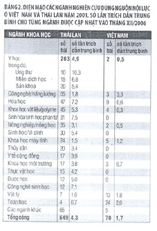 Số bài báo phân theo các ngành khoa học trên bảng 2 cho ta bức tranh về diện mạo rất tương phản nhau của các ngành khoa học được nghiên cứu ở hai nước. Hai ngành mạnh nhất của Việt Nam là Toán và Vật lý lại nằm trong số những ngành yếu nhất ở Thái Lan về số bài báo quốc tế lẫn số lần trích dẫn. Còn những ngành vượt trội nhất và có tác động trực tiếp nhất đến sản xuất và đời sống của Thái Lan là y học, sinh hoá và công nghệ sinh học, thì hầu như Việt Nam không có công trình nào đáng kể.