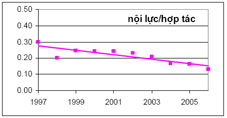 Hình 2. Tỷ lệ giữa số bài báo do nội lực và do hợp tác giảm liên tục trong mười năm gần đây.