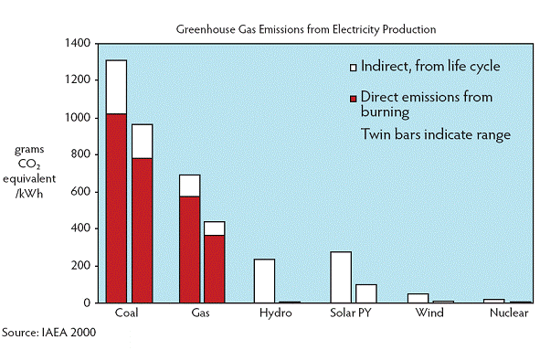 · Tiêu thụ điện, xăng dầu cùng các sản phẩm năng lượng khác có nguồn gốc hóa thạch đã được khẳng định là nguồn đã và đang phát ra một lượng khí thải khổng lồ vào khí quyển gây hiệu ứng nhà kính (green house effect) làm nóng dần hành tinh, với những hệ quả rất nguy hại đến cuộc sống của loài người (đặc biệt Việt Nam sẽ là một trong những điểm bị ảnh hưởng tồi tệ nhất của hiệu ứng nhà kính). Trong khung cảnh này, ĐHN (nuclear power), với mức thải khí CO2 gần bằng không so với các nguồn nhiệt điện dùng nhiên liệu than hoặc dầu khí… (xem Hình 1 dưới đây), là một giải pháp quan trọng cho sự phát triển kinh tế xã hội bền vững, giữ được một môi trường sống thân thiện và an toàn cho chúng ta và cho các thế hệ tương lai.