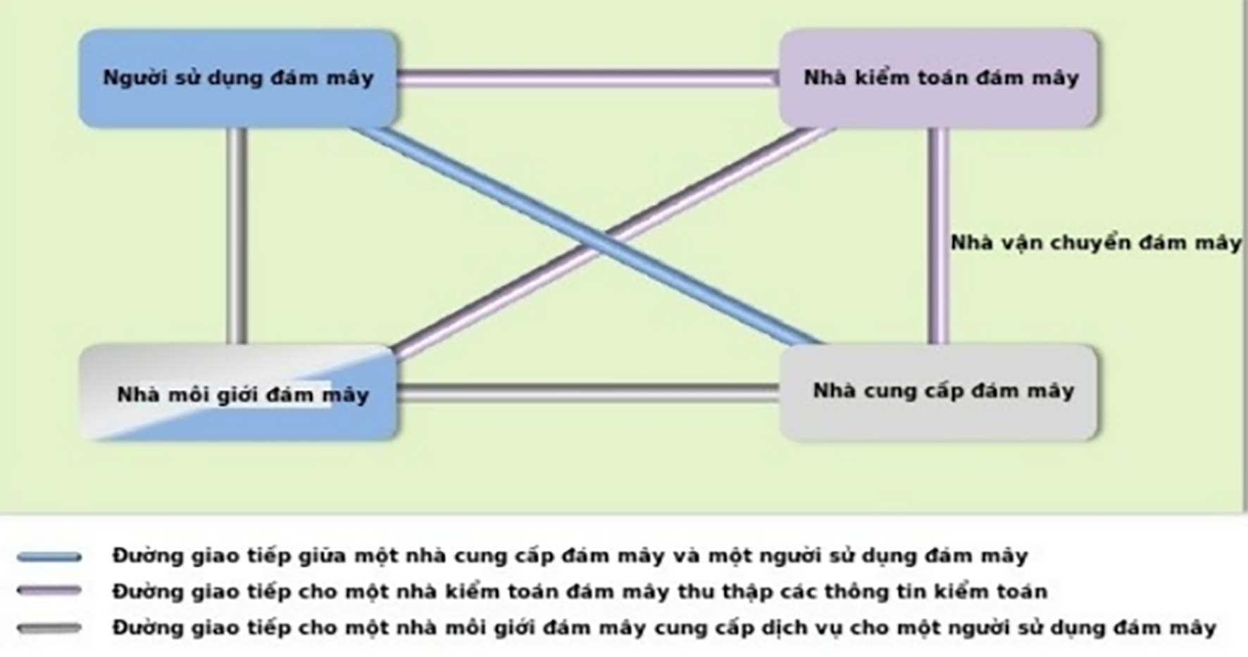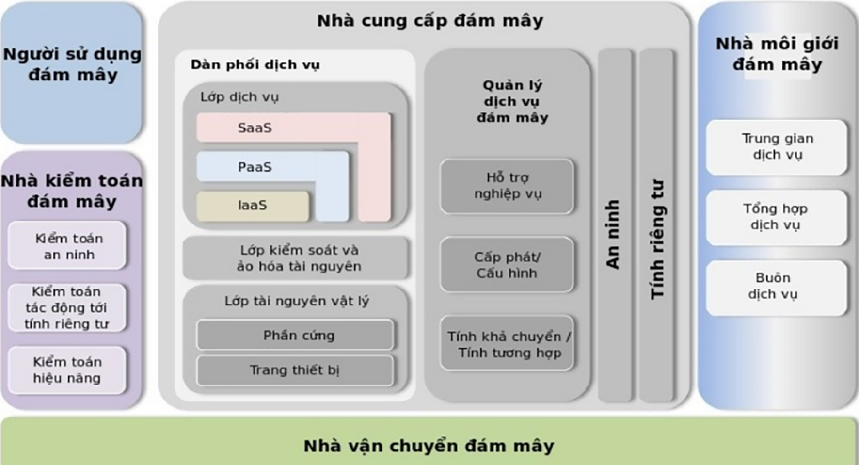 Hơn nữa, việc vận hành thị trường đám mây không chỉ có người sử dụng dịch vụ và nhà cung cấp dịch vụ đám mây mà có tới ba đối tượng khác gồm Nhà kiểm toán (một bên tiến hành đánh giá độc lập về các dịch vụ đám mây, các hoạt động hệ thống thông tin, hiệu năng và an ninh của triển khai đám mây); Nhà môi giới (một tổ chức quản lý sử dụng, hiệu năng và phân phối các dịch vụ đám mây, và kết nối giữa các nhà cung cấp đám mây và những người sử dụng đám mây); và Nhà vận chuyển đám mây (tổ chức cung cấp kết nối và vận chuyển các dịch vụ đám mây từ nhà cung cấp đến người sử dụng).