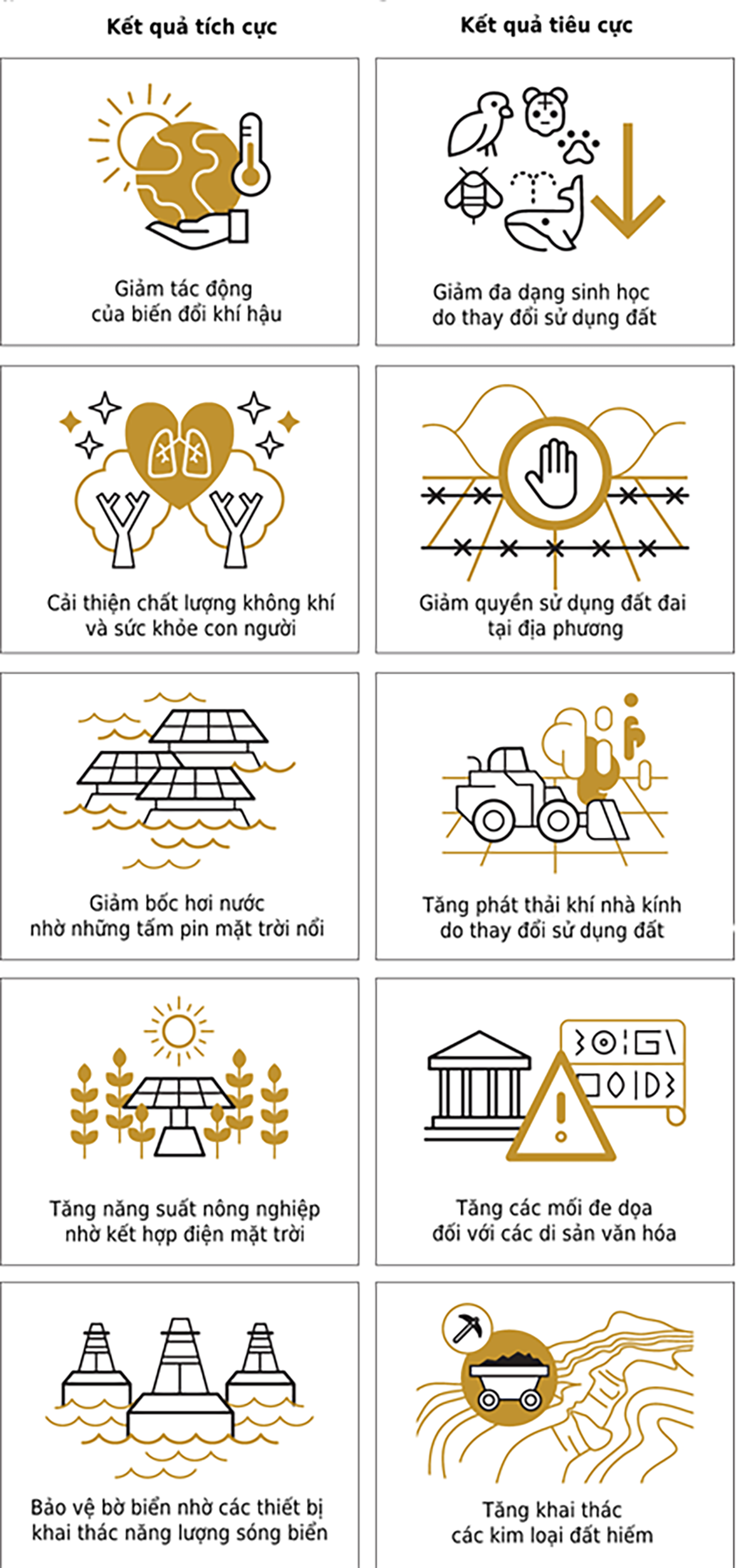 Hình 1: Những kết quả tích cực và tiêu cực của việc phát triển năng lượng tái tạo. (a,b) Khi đưa ra những quyết định khôn ngoan và chặt chẽ, các phát triển năng lượng tái tạo có thể đóng góp tích cực (a) cho các mục tiêu không liên quan đến năng lượng. Nếu ngược lại, có thể dẫn đến kết quả tiêu cực (b) ở những mục tiêu khác.