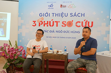 Anh Ngô Đức Hùng (trái) trong buổi giới thiệu ra mắt sách 3 phút sơ cứu của anh.
