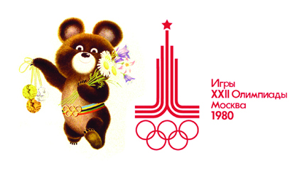 ![]() Linh vật chú gấu Misha và hình vẽ biểu tượng Olympic Moscow 1980 |