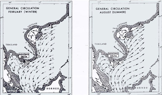 ![]() Hình 1. Sơ đồ hướng di chuyển của các dòng hải lưu tại biển Đông |