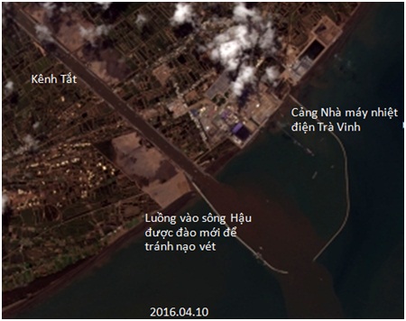Ảnh vệ tinh ngày 10.04.2016. Luồng vào sông Hậu được đào mới thay thế Luồng Định An để tránh nạo vét hàng năm. Với màu phù sa trong ảnh, e rằng nạo vét sẽ còn bức bách hơn.