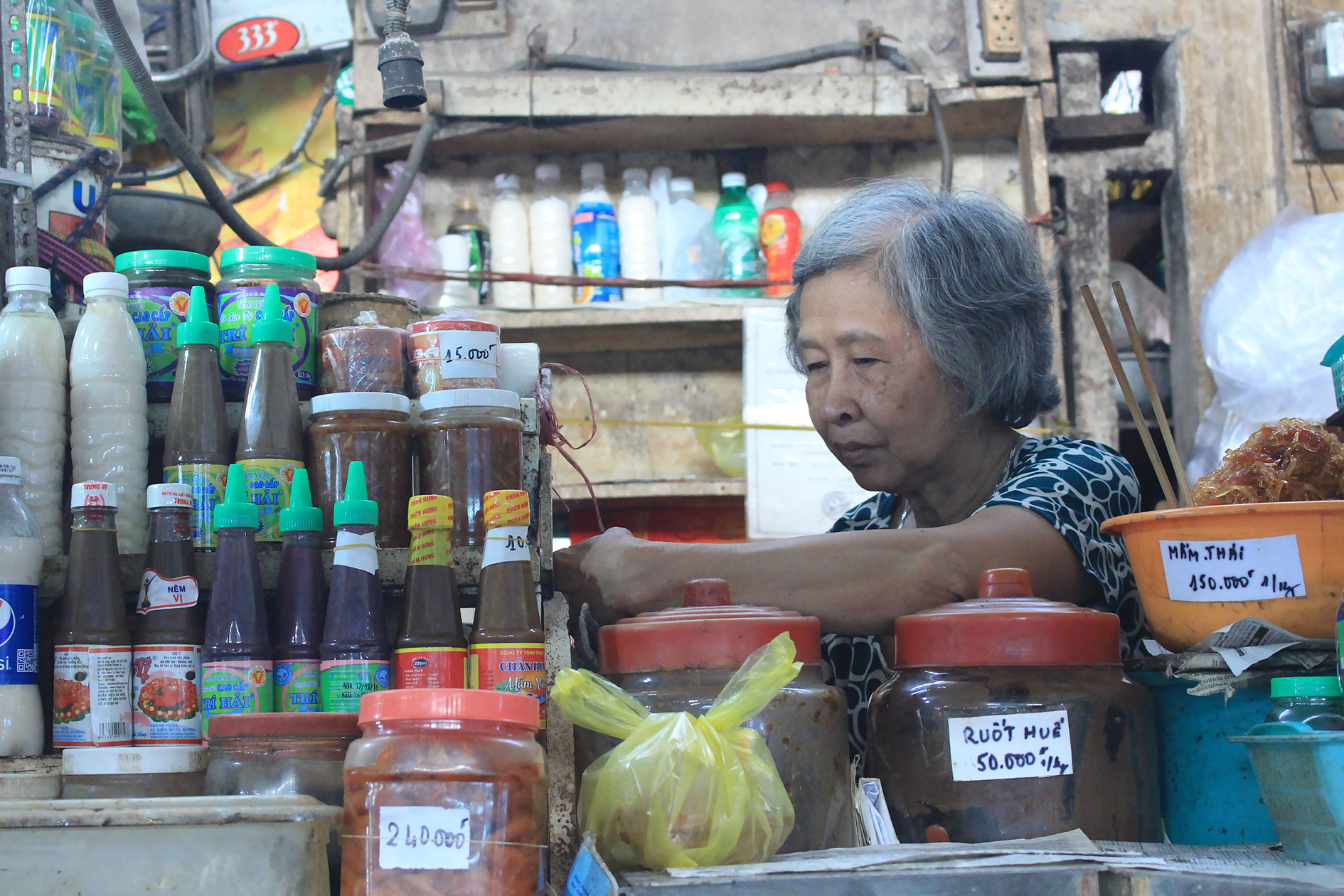 Tăng giá đồng loạt sản phẩm hàng hóa dịch vụ, đặc biệt là những hàng hóa dịch vụ thiết yếu do tăng thuế suất thuế GTGT, có thể ảnh hưởng rõ rệt đến nhóm dân cư có thu nhập từ mức trung bình thấp trở xuống. Một cửa hàng bán mắm ở chợ Bà Chiểu. Ảnh: Vũ Phượng/thanhnien.vn