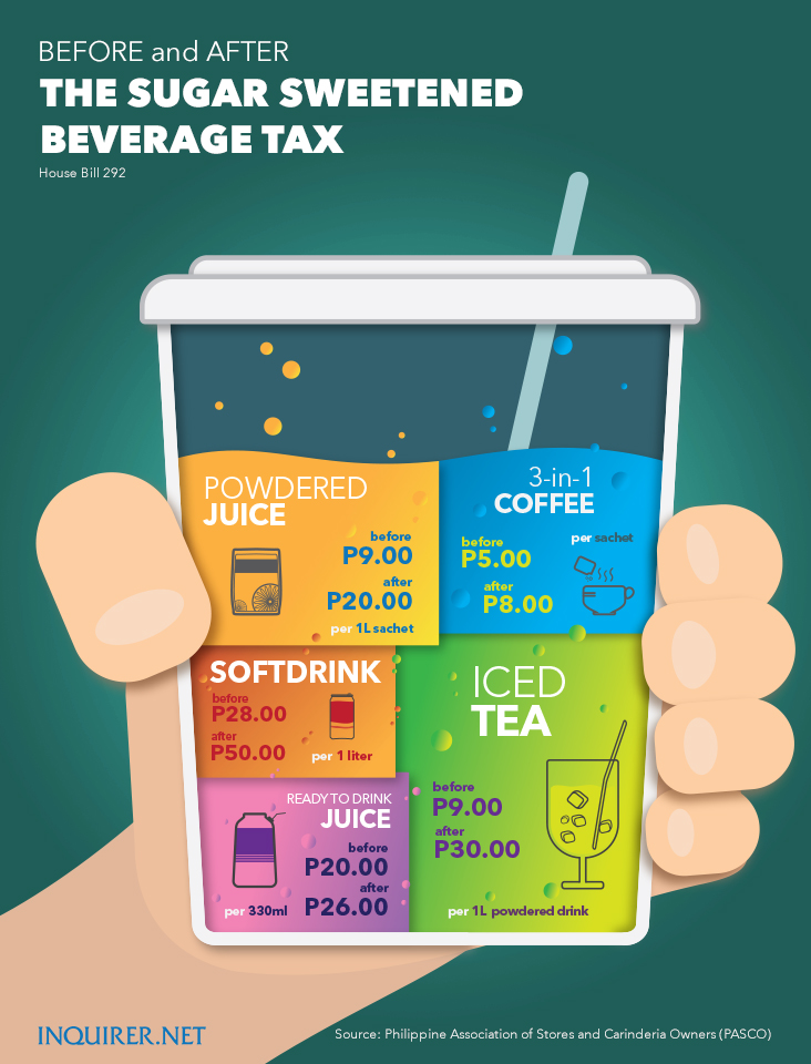 Minh họa giá đồ uống trước và sau thuế đồ uống có đường tại Philippines. Nguồn: Philippines Association of Stores and Carinderia Owners