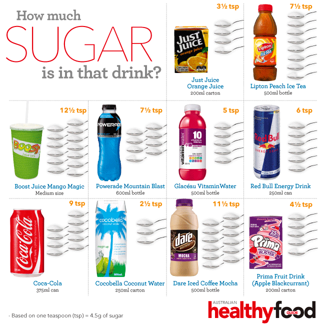 Minh họa lượng đường trong các sản phẩm đồ uống tại Úc. Nguồn: Australian Healthy Food Guide