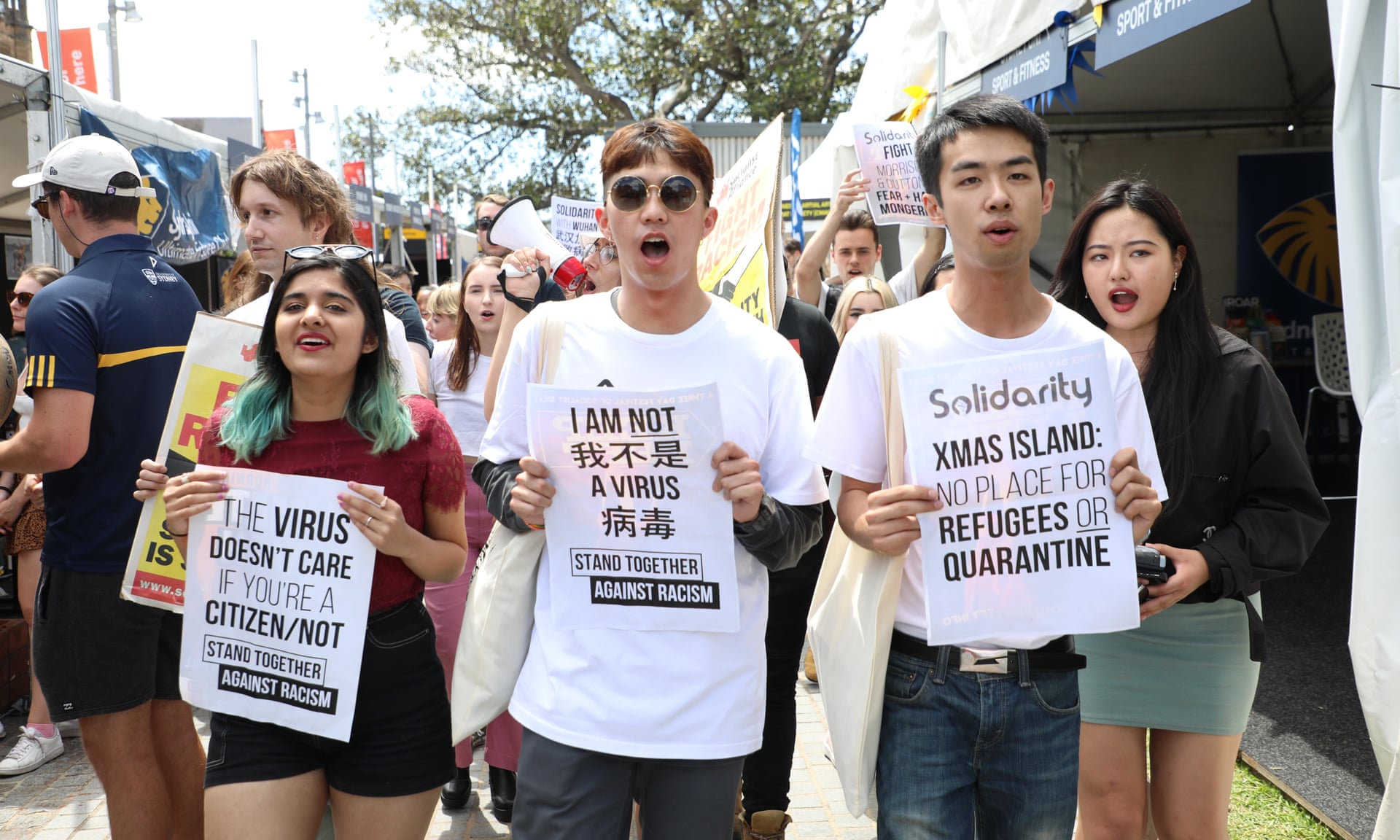 Đại dịch Covid-19 đã khiến cho các tin sai lệch về sức khỏe đan cài với các tin mang đậm màu sắc chính trị và phân biệt chủng tộc tấn công vào các nhóm yếu thế khác nhau. Trong ảnh là người Trung Quốc ở Úc biểu tình chống phân biệt đối xử. Nguồn: Theguardian.