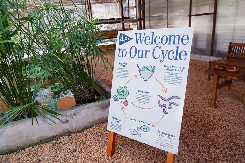 Chi nhánh Xuân Thủy, Quận 2, Tp. HCM của Pizza 4P’s sử dụng trùn quế để phân hủy một phần rác thực phẩm (70kg/ tháng)2. Ấn tượng hơn nữa khi chi nhánh này được xây dựng theo mô hình ‘edutainment’ (giáo dục giải trí) với mong muốn giới thiệu, ‘giáo dục’ cho thực khách về mô hình bền vững thông qua trải nghiệm ẩm thực. Ở đây có một vườn rau hữu cơ được bón phân từ rác thải thức ăn đã qua xử lý và tưới với nước từ ao nuôi cá. Chất thải từ cá khiến nước từ ao cung cấp thêm dưỡng chất cho rau. Nhà hàng này cũng sử dụng tấm lợp pin mặt trời để giảm 20.8 tấn CO2 (có phần mềm theo dõi năng lượng, tính từ 5/2019 đến 1/2021). Và như vậy, thực khách được thích thú trải nghiệm một không gian thân thiện với thiên nhiên và một mô hình vòng tròn về bền vững! Nét độc đáo này chắc chắn đã tạo thêm điểm nhấn và sự khác biệt của Pizza 4P’s với những đối thủ khác.