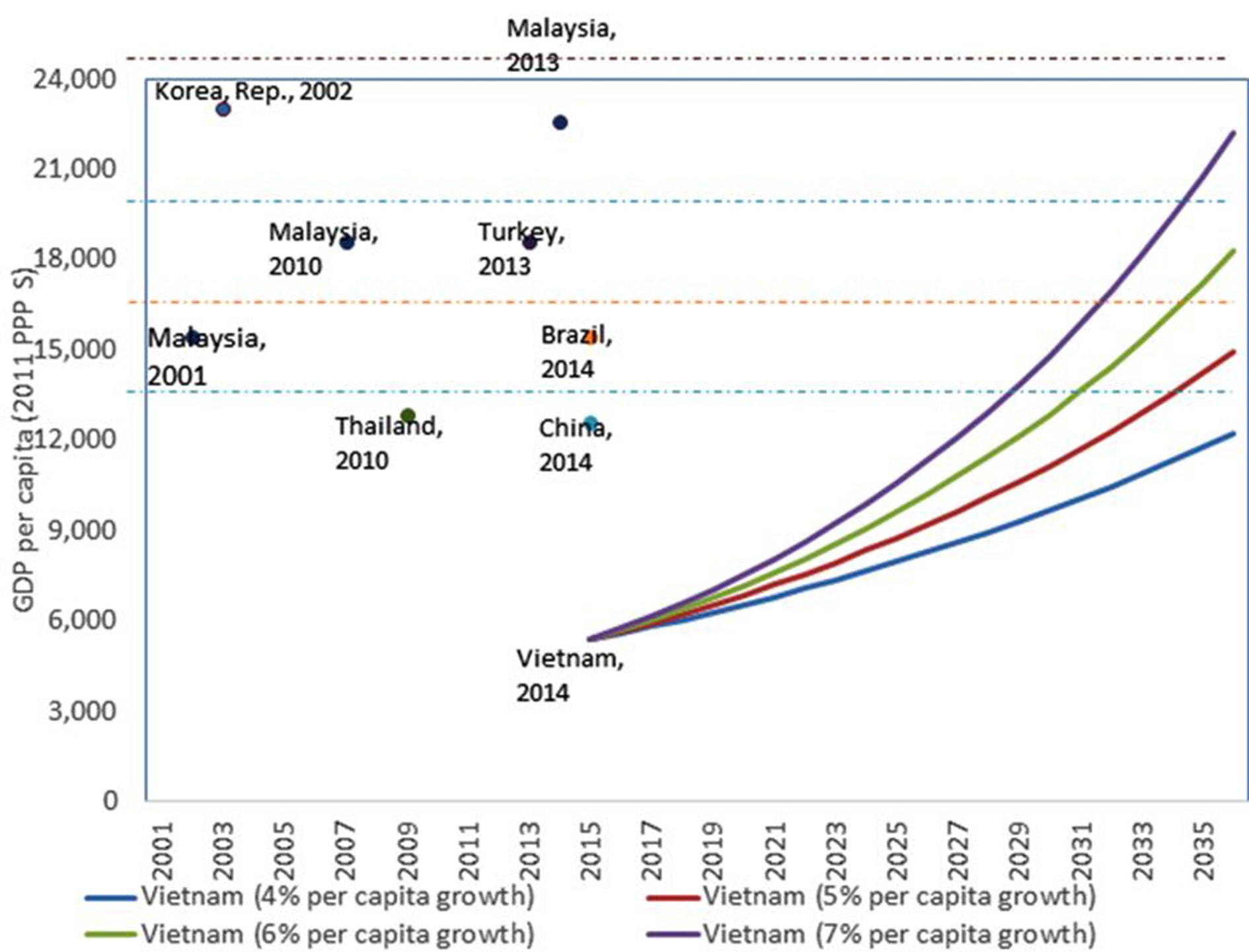 Báo cáo Việt Nam 2035 do Chính phủ Việt Nam và Worlbank đặt mục tiêu đưa Việt Nam trở thành nước thu nhập trung bình cao, hướng tới một xã hội thịnh vượng, sáng tạo, công bằng và dân chủ vào năm 2035 (theo OECD thì phải đến năm 2058 Việt Nam mới trở thành nước giàu) – xem Bảng 1.