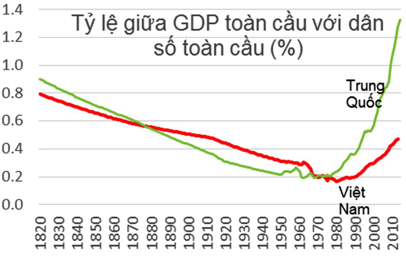 Bảng 2: Quy mô kinh tế so với quy mô dân số, so sánh Việt Nam và Trung Quốc. Nguồn: Báo cáo Việt Nam 2035.