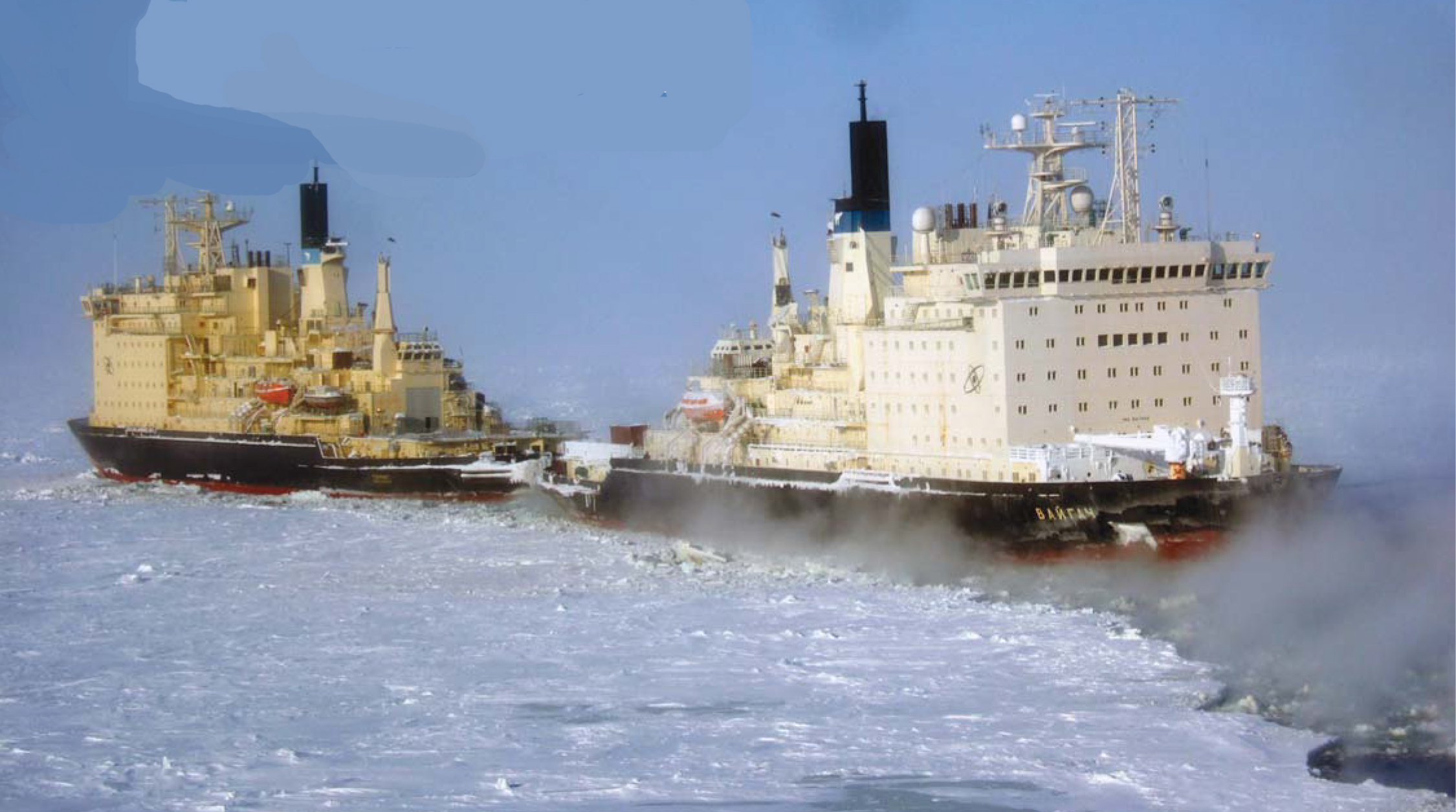 Hình 2: Tàu phá băng hạt nhân Taymyr (trái) và Vaygach (phải) được thiết kế với khả năng di chuyển ở vùng nước nông gần bờ, nhưng vẫn có khả năng phá vỡ các lớp băng dày nhiều năm ở Bắc Băng Dương. (Ảnh của Aker Arctic.)