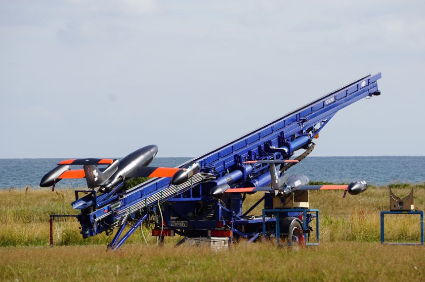Trên bãi tập Todendorf ở Panker, huyện Plön, bang Schleswig-Holstein, nội trong một ngày người ta đã phóng một loạt máy bay không người lái từ bệ phóng mặt đất. Chúng có nhiệm vụ tháp tùng một máy bay phản lực Learjet bay trên vùng biển Ostsee. Máy bay Learjet này trang bị buồng lái của máy bay chiến đấu. Từ đây phi công có thể quyết định về hướng bay cũng như tác động đến loạt máy bay không người lái trong việc thực hiện các chức năng nhiệm vụ của chúng. Nói chung loạt máy bay không người lái luôn bay trước máy bay – đây cũng là một dạng hệ thống báo động sớm.