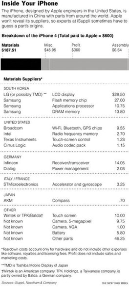 Phân tích mới nhất chỉ ra rằng phần chi phí nhỏ nhất của Apple là ở Thâm Quyến, nơi những người công nhân lắp ráp theo dây chuyền các bộ phận như mạch vi xử lý từ Đức và Hàn Quốc, bộ xử lý bắt tín hiệu Wifi và sóng điện thoại làm từ Mỹ, màn hình cảm ứng từ Đài Loan, cùng với hơn 100 linh kiện khác.
