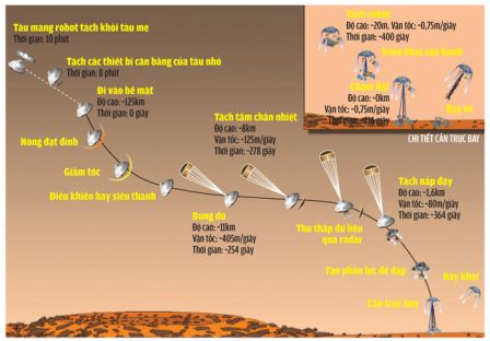 Ở độ cao 1,6 km phía trên bề mặt sao hỏa, một cỗ máy hạ cánh đặc biệt sẽ tách ra, với 8 động cơ phản lực ở các góc. Robot nằm thăng bằng trên các ống xả phản lực, tốc độ chậm lại, còn khoảng 2,7 km/giờ, với sự hỗ trợ của một chiếc dù siêu thanh công nghệ cao.