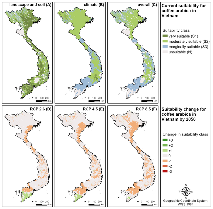 A: cảnh quan hiện tại và độ phù hợp của đất trồng trọt, B: sự phù hợp của khí hậu hiện tại với cây trồng. C: sự phù hợp tổng thể với cây trồng. D: sự thay đổi mức độ phù hợp với RCP (RCP = representative concentration pathway – đường phân bố nồng độ khí nhà kính đại diện) 2.6 (lượng phát khí thải thấp). E = sự thay đổi mức độ phù hợp với RCP 4.5 ( lượng phát khí thải trung bình). F – sự thay đổi mức độ phù hợp với RCP 8.5 ( lượng phát khí thải cao). Ảnh: Grüter et al., 2022, PLOS ONE, CC-BY 4.0