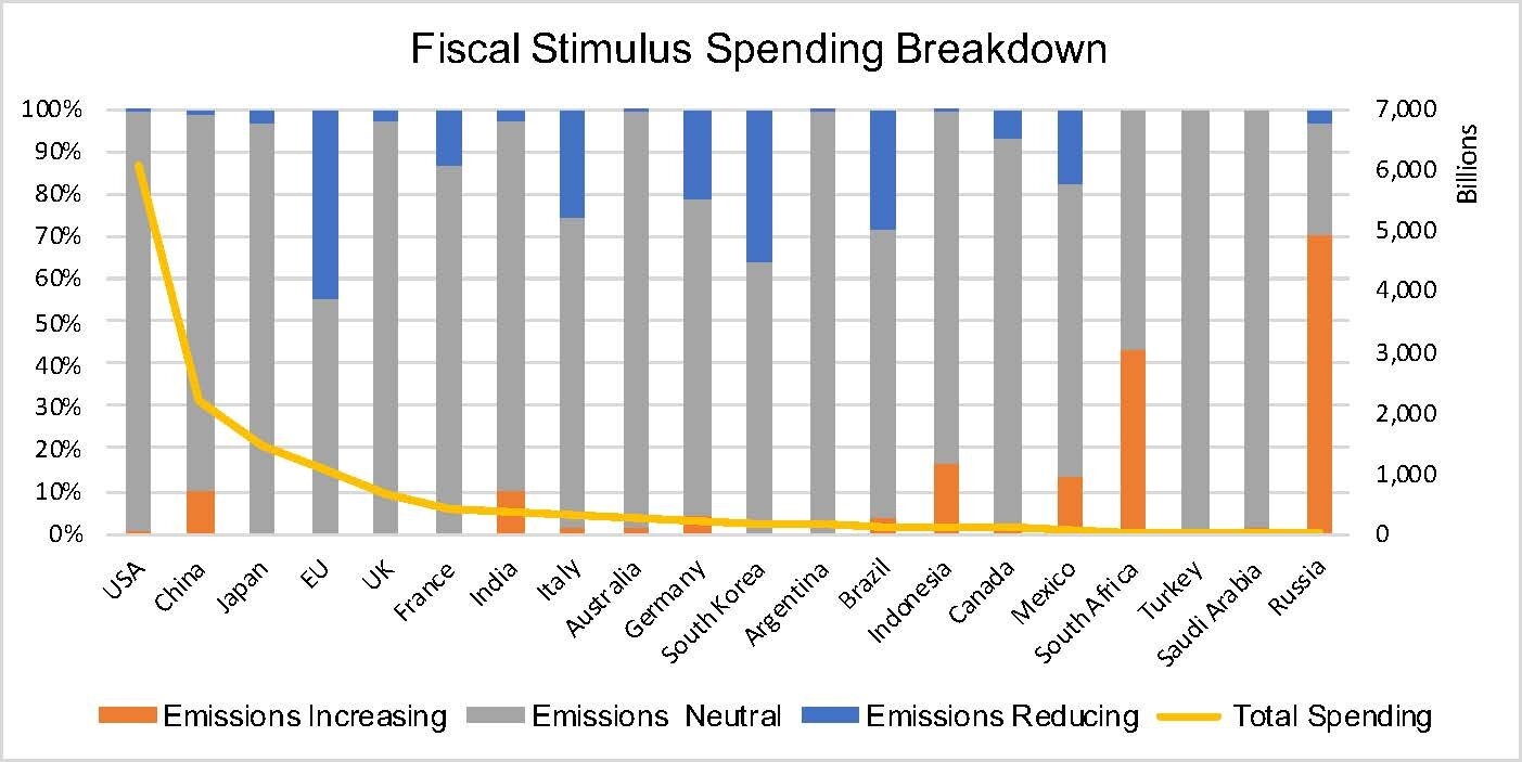 Các quốc gia dành nhiều ngân sách nhất cho các gói kích thích kinh tế xanh là Hàn Quốc và EU, trong đó mỗi nước dành hơn 30% chi tiêu cho các gói như vậy. Thấp hơn một chút là Brazil, Ý và Đức khi dành hơn 20% ngân sách phục hồi cho các dự án xanh, trong khi đó Pháp chỉ dành khoảng hơn 10%. Ngược lại, các quốc gia gần như không có các dự án liên quan đến khí hậu trong kế hoạch phục hồi của mình là Mỹ, Nga, Anh và Nhật Bản, khi chỉ dành dưới 5% tổng ngân sách cho các dự án xanh.