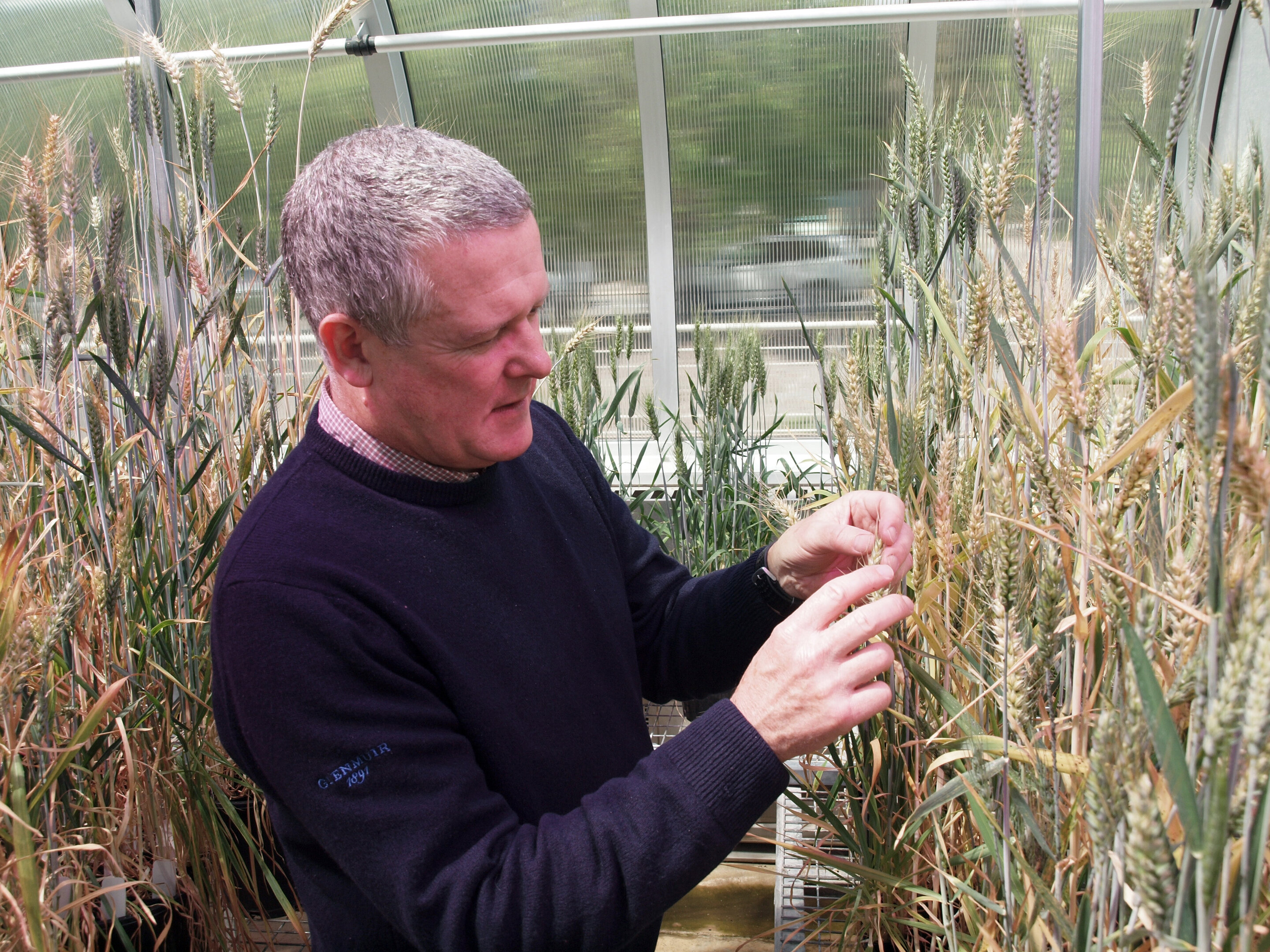 Phó giáo sư Ken Chalmers đang kiểm tra các hạt lúa mì trồng trong nhà kính.