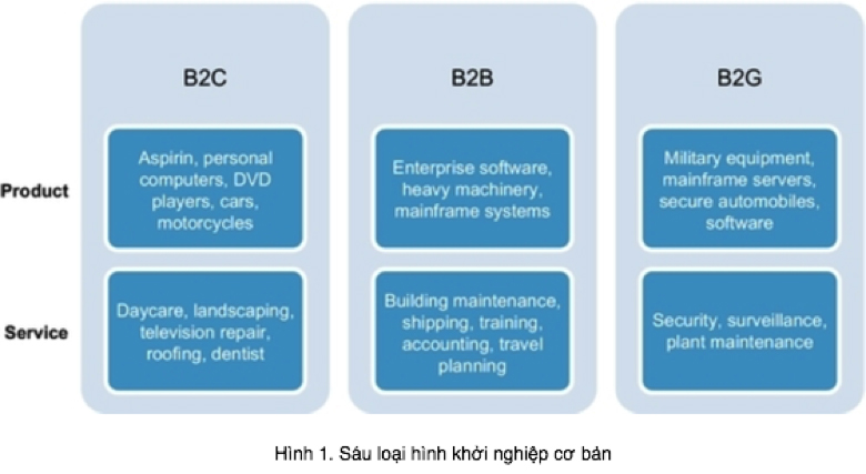 Bạn có thể khởi động một startup tạo ra giá trị cho doanh nghiệp, khách hàng hoặc chính phủ. Bạn cũng có thể tạo ra một startup tập trung chủ yếu vào sản phẩm hoặc dịch vụ. Đó thực sự là lựa chọn của riêng bạn. Khung các loại hình khởi nghiệp cơ bản như trình bày trong Hình 1 cung cấp một hởi đầu thuận tiện trong quy trình phát triển ý tưởng khởi nghiệp của bạn, nhưng trong thực tế nó thường không đơn giản như vậy. Nhiều startup cung cấp cả sản phẩm và dịch vụ cho khách hàng. Ví dụ, các startup chuyên về phần mềm doanh nghiệp thường cung cấp dịch vụ cài đặt phần mềm mới cho khách hàng, hay các “gói bảo trì”, bao gồm cả hỗ trợ kỹ thuật trong trường hợp có vấn đề phát sinh trong quá trình sử dụng và khách hàng phải trả phí cho các dịch vụ đó.
