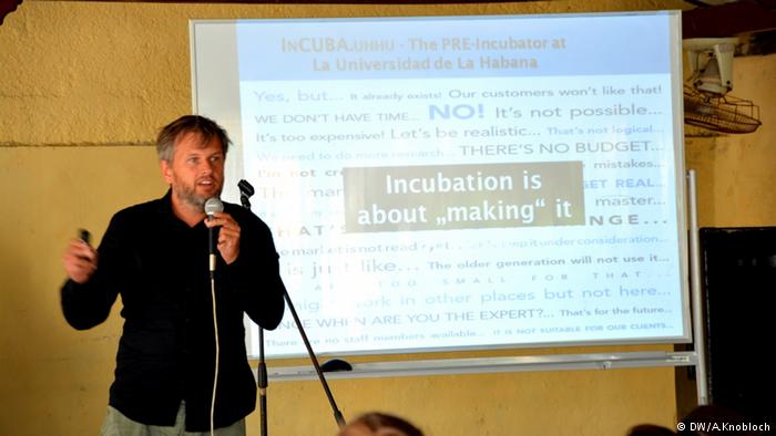 Jan Ehlers trình bày về ý tưởng kinh doanh trong một khóa hướng dẫn tăng tốc khởi nghiệp tại Cuba. Ảnh: DW