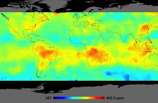 Dữ liệu do vệ tinh OCO-2 của NASA chứng tỏ mức CO2 trung bình trong bầu khí quyển hơn 5 tuần trong năm 2014. Nguồn: NASA/JPL-Caltech.
