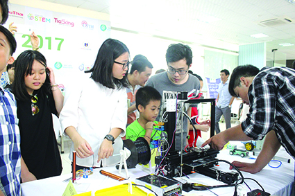 Cần triển khai giáo dục STEM từ phổ thông. Ảnh: Học sinh thử nghiệm máy in 3D trong ngày hội STEM năm 2017.