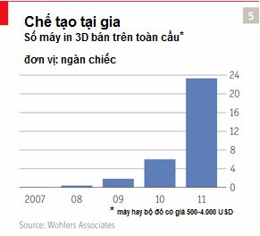 Một số người đã có máy in 3D ở nhà rồi. Giá hệ thống in 3D công nghiệp khởi đầu vào khoảng $15.000 và lên đến hơn 1 triệu $, Wohlers nói. Nhưng các máy để bàn rẻ hơn đang tạo ra một thị trường hoàn toàn mới (xem hình 5). Đấy là các hobbyist (người thú say mê), những người thích tự làm, những người thích mày mò, các nhà sáng chế, các nhà nghiên cứu và các nhà khinh doanh khởi nghiệp. Một số hệ thống in 3D có thể được xây dựng từ các bộ đồ lề (kit) và sử dụng phần mềm nguồn mở. Nhưng các nhà sản xuất lớn về máy in 3D cũng đang bước vào thị trường.