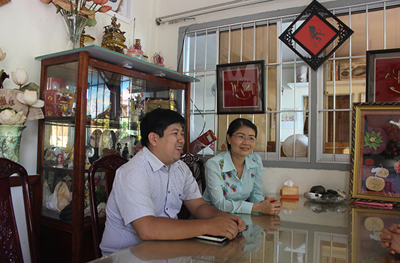 Anh Ngô Chí Công (trái) và chị Phạm Thị Ngọc Đào, phó giám đốc Sở Kế hoạch – Đầu tư tỉnh Đồng Tháp tại nhà của của anh Công. Chữ “Mần” viết kiểu thư pháp được treo trên tường là do Bí thư Tỉnh ủy Lê Minh Hoan tặng anh trong dịp Tết.