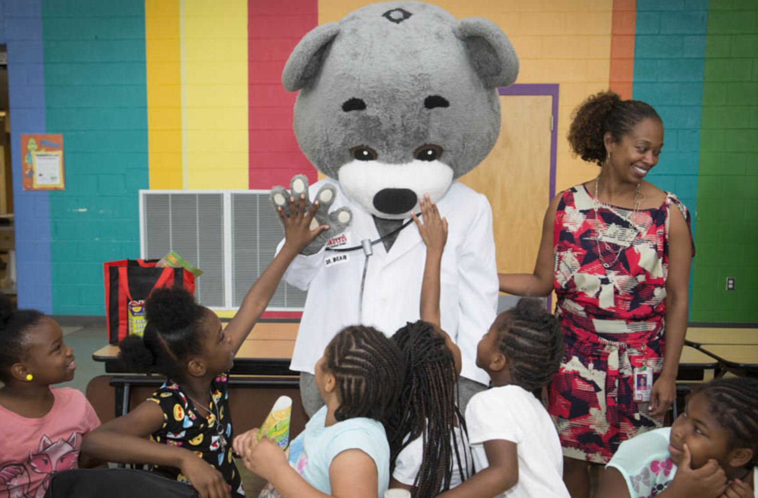 Trẻ em thích thú trò chuyện với linh vật hình bác sĩ, một hoạt động do Bảo tàng Smithsonian kết hợp với Chương trình Sức khỏe cộng đồng của Mỹ thực hiện. Nguồn ảnh: anacostia.si.edu.